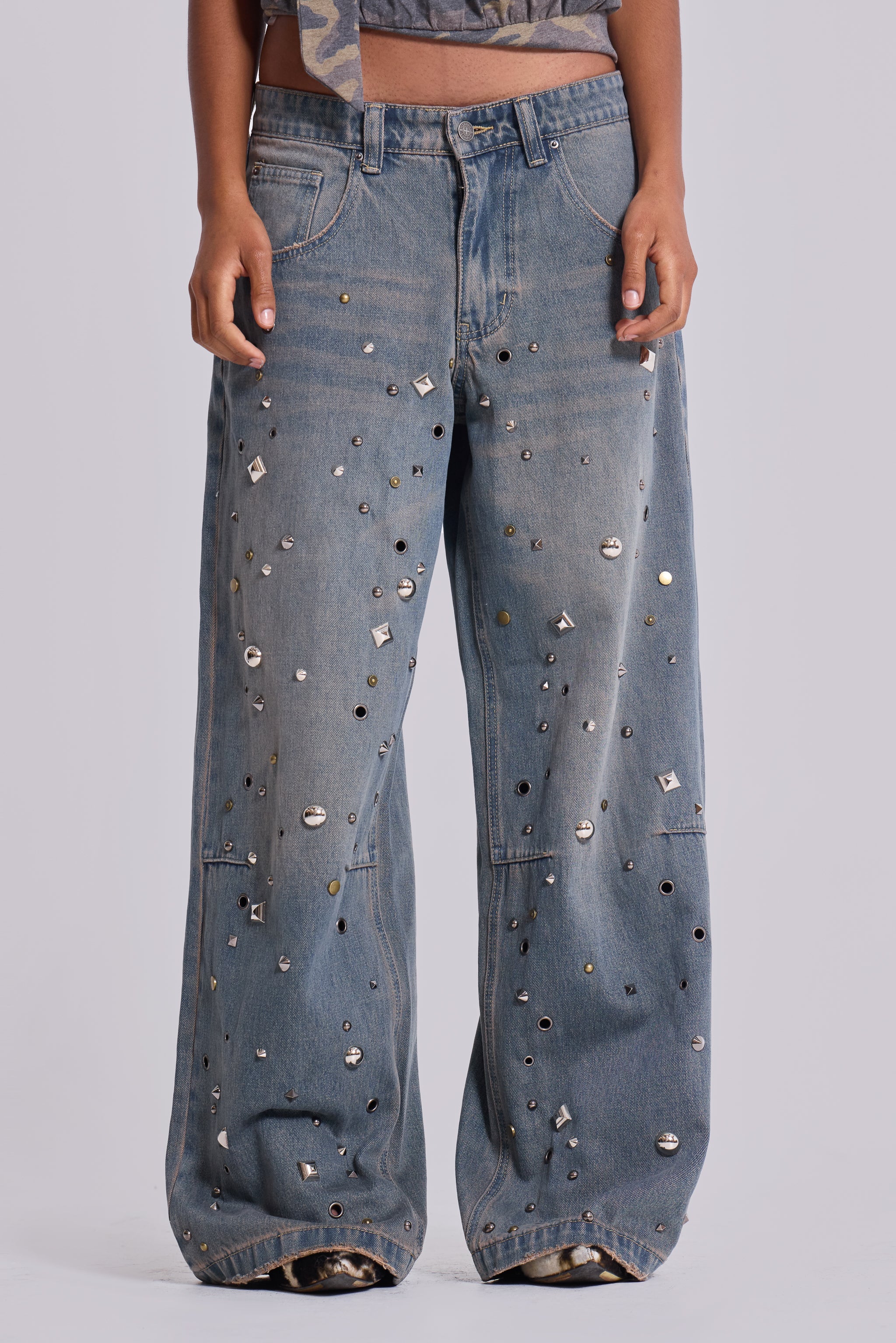 Bolted Studded Colossus Jeans. Studded Colossus Jeans in Grey Blue Wash. These Colossus jeans have been designed in an oversized skate fit. enhance by its low-rise Colossus fit. Upgraded with a wide range of studs. in a range of colours and sizes. all over the front legs and pockets. Crafted from heavyweight denim delivering an unparalleled balance of comfort and timeless style.