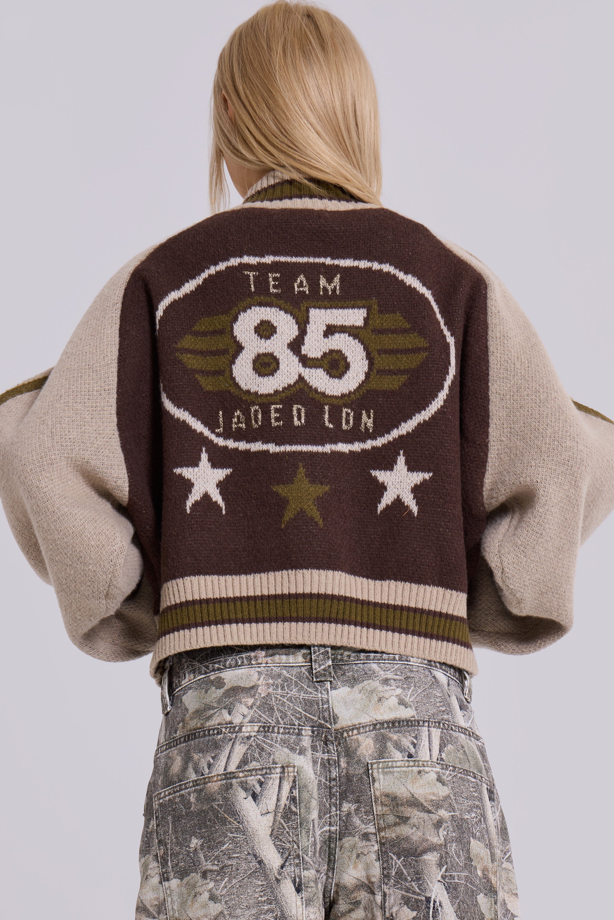 Team 85 Knitted Bomber Jacket. Team Jaded Knitted Zip Through bomber in a heavyweight chunky knit fabric and an oversized cropped fit. This jacket features a funnel neck collar with patch front pocket detailing.