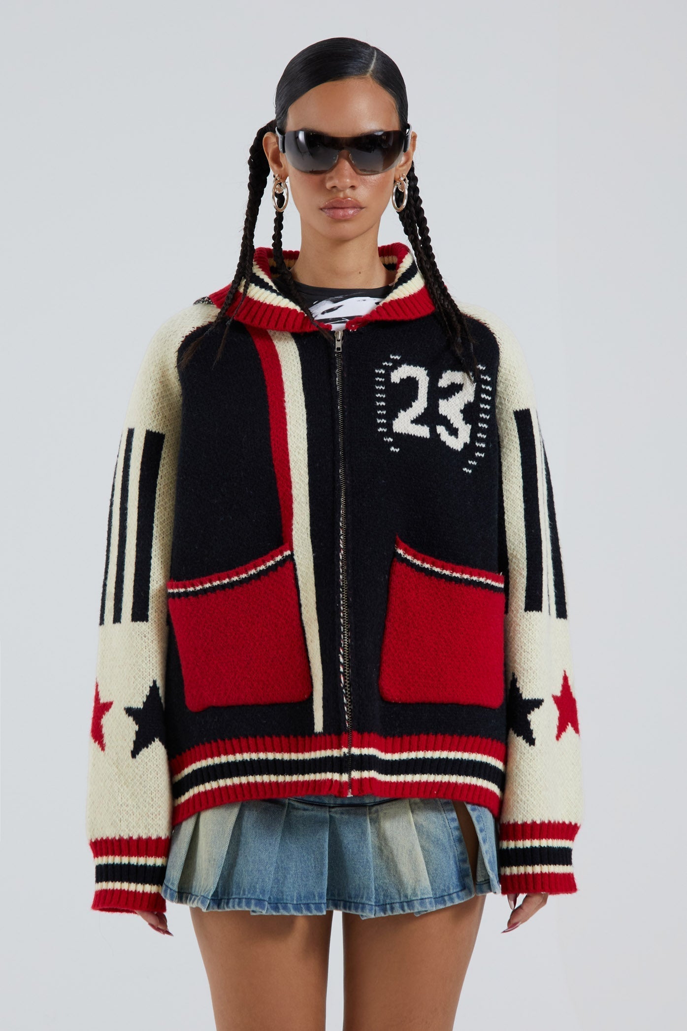 Introducing the Team 23 Knitted Zip Through: Crafted from a heavyweight chunky knit fabric in an oversized fit. This jacket features a shawl collar with patch pocket detailing.