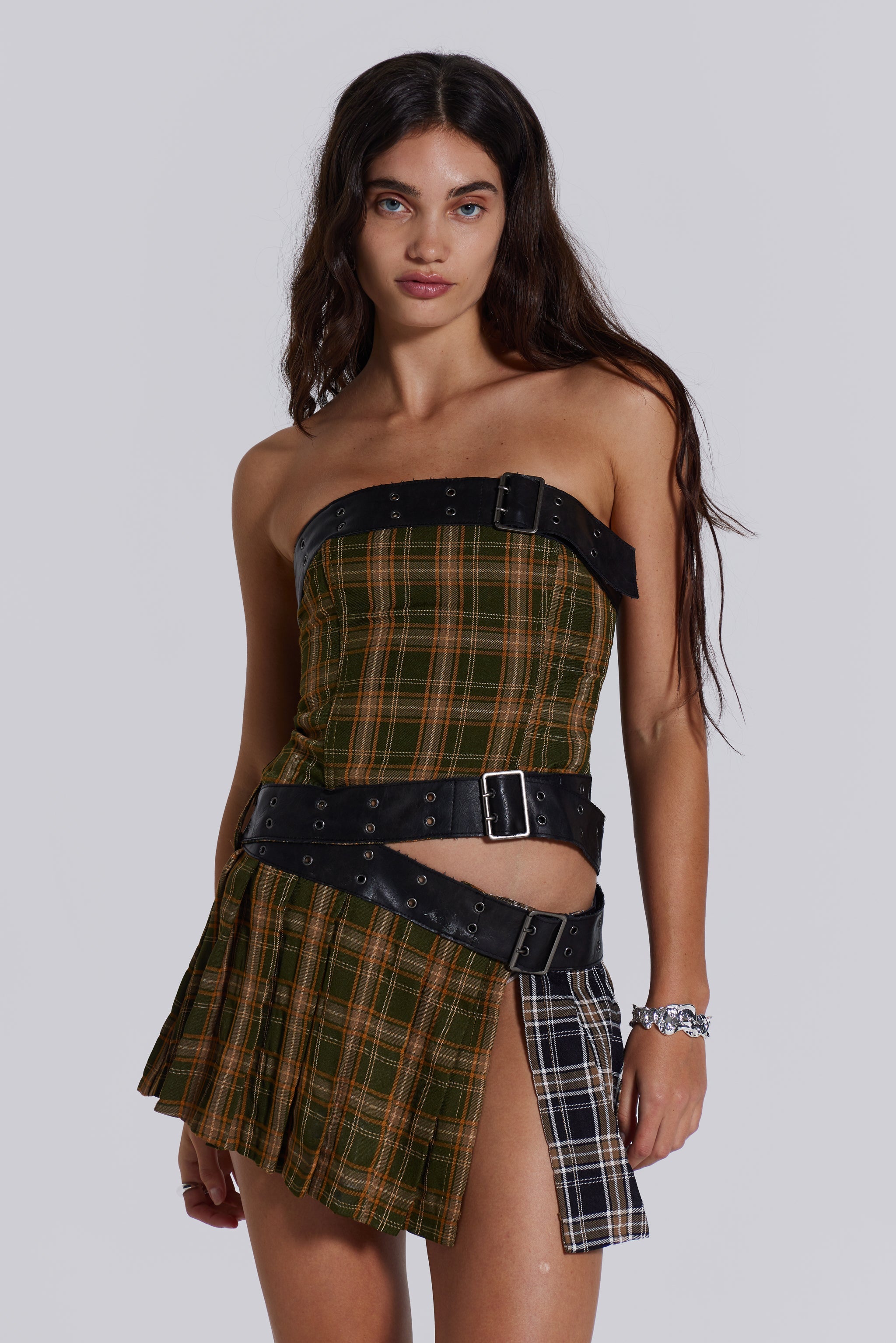Presenting the Eden Buckle Mini Dress – Crafted with a two-tartan fabric. this mini-length dress is cut into a bandeau off the shoulder silhouette with a pleated hem and cut out side. Adorned with a functional belt detail at the skirt and decorative belts at the cutout and neckline.Â