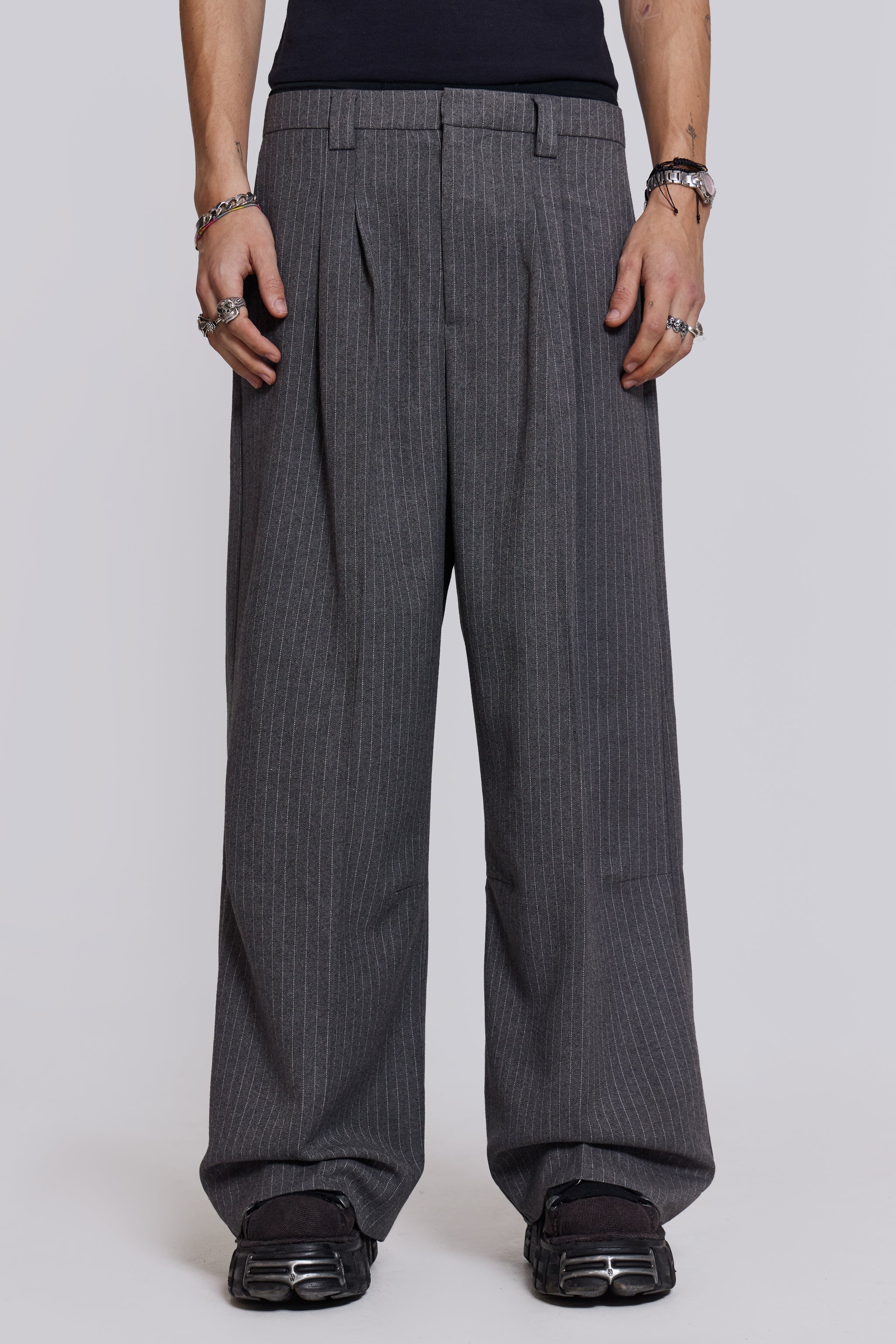 The Goliath Light Grey Pinstripe Suit Pant is crafted with a classic mid-weight suiting fabric and twin pleats to the waistband for added volume. The design features a fixed waistband with belt loops and sits in a mid-low rise fit.