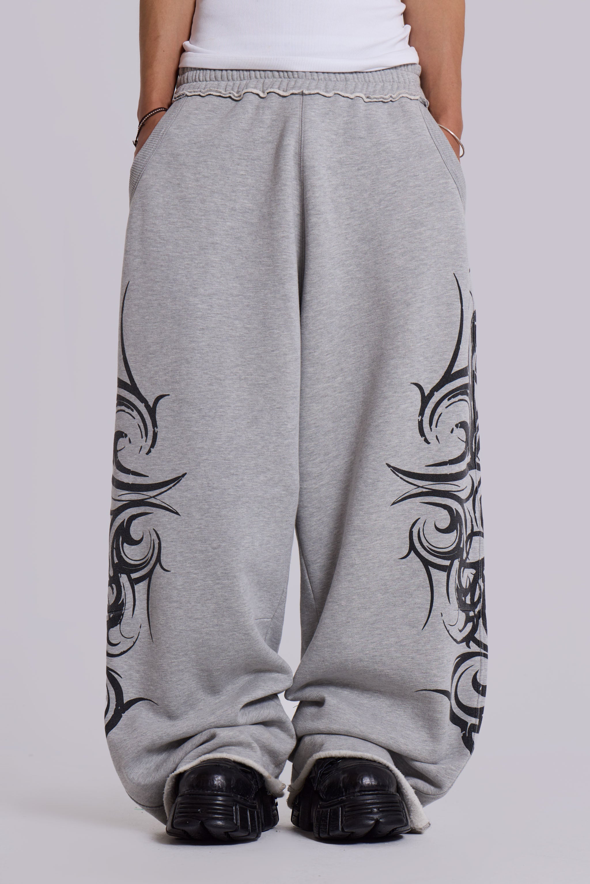 The Grey Blade Joggers are crafted from a fleece back heavy sweat fabric. with a vintage wash and elasticated draw cord waistband and tailored in an oversized Monster fit.