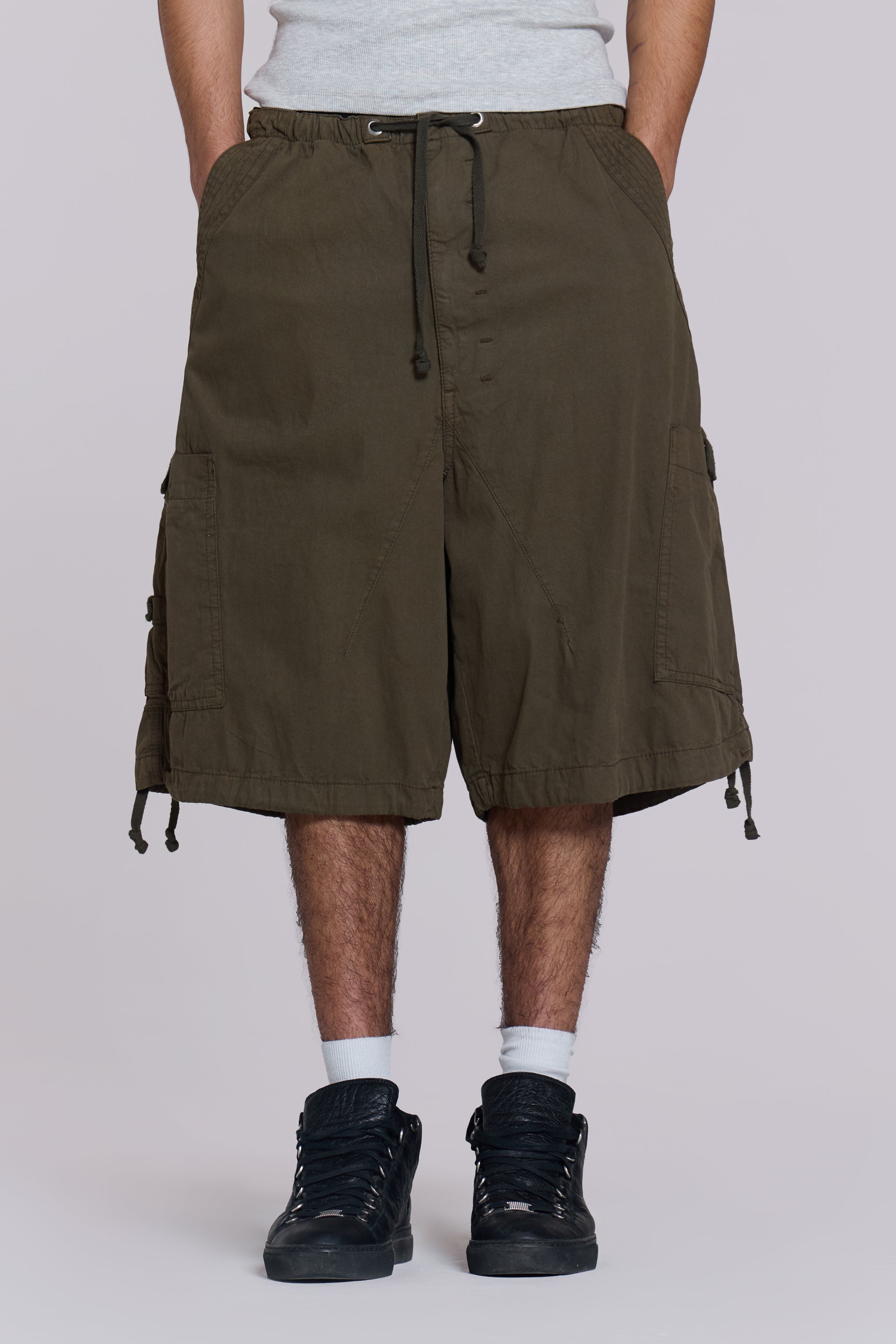 Discover the unparalleled comfort and style of the Khaki Parachute Cargo Baggy Shorts. These shorts feature an oversized fit and six-pocket styling. accompanied by an elasticated waistband and adjustable cotton drawcord for added flexibility.