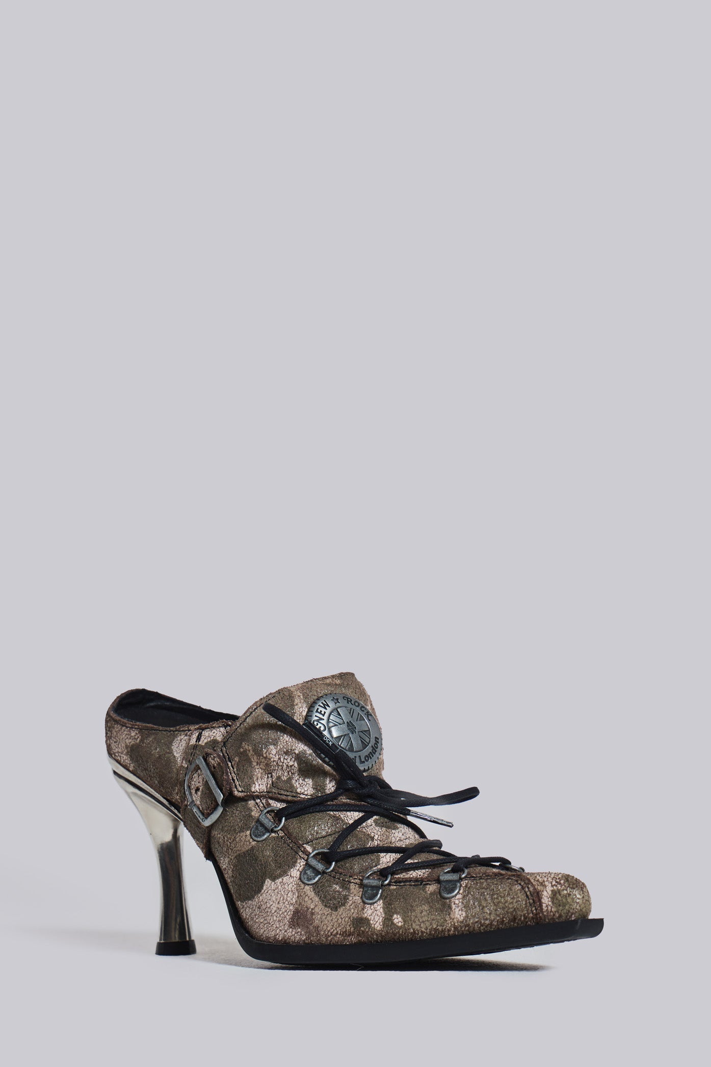 New Rock for Jaded London cracked camouflage leather heeled mules with lace up branding and buckled harness featuring metal finish curved heel.