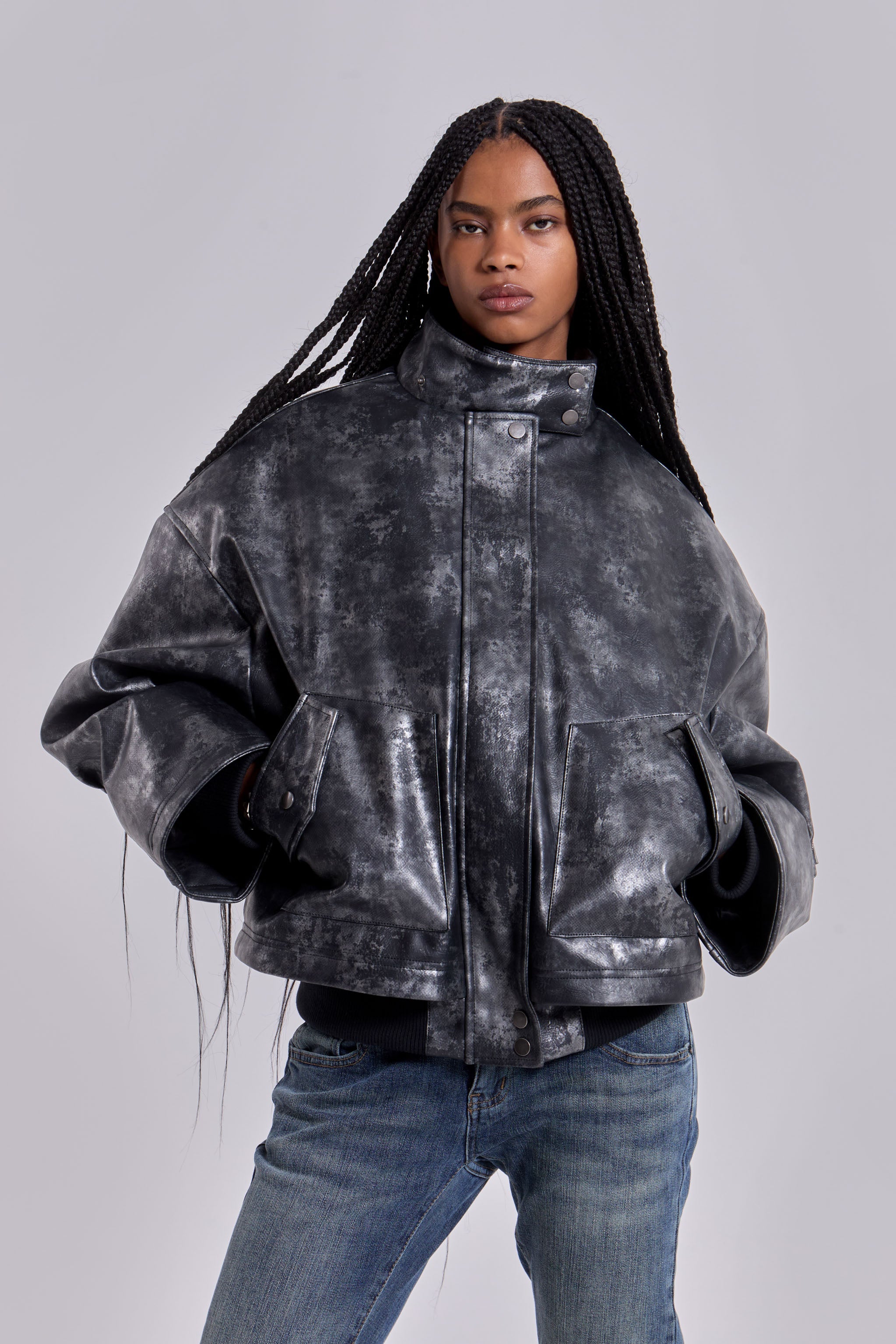 Mottled metallic PU leather oversized bomber jacket with faux fur lined detachable split hood.