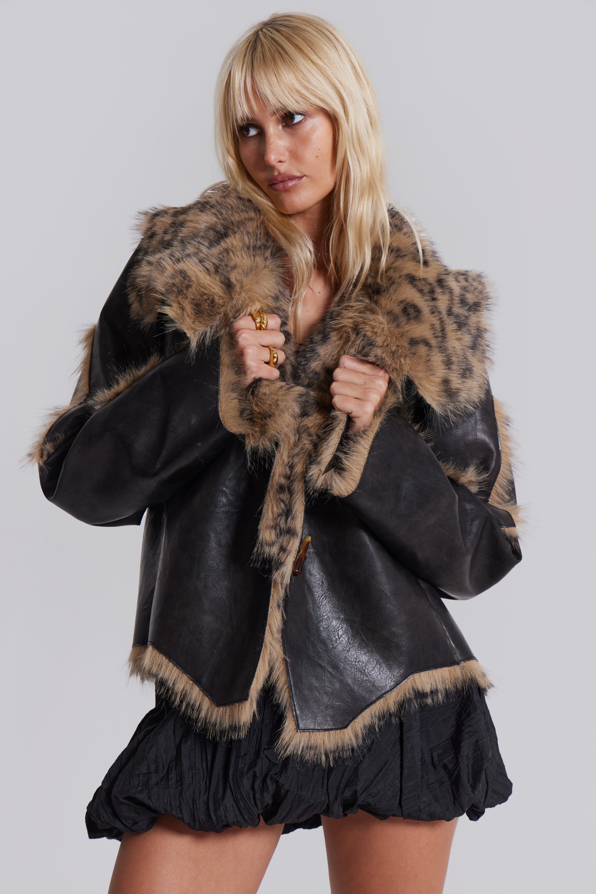 Introducing the Seone Faux Fur Jacket. crafted from a washed black PU leather with a leopard print faux fur lining. This oversized fit jacket features jagged panels and horn toggle fastening.