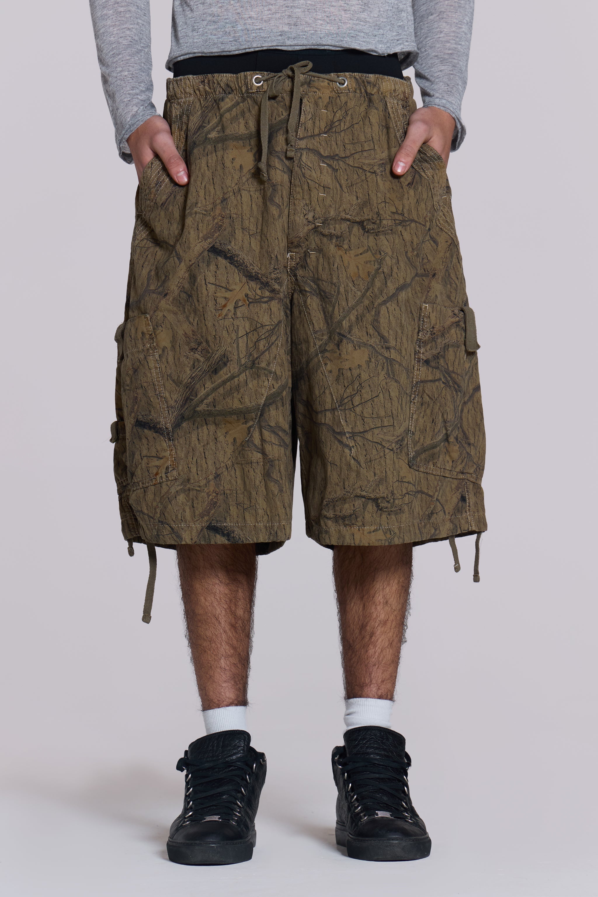Designed with an oversized fit and a combination of metal eyelets. zip fly and adjustable cotton drawcord. our Forest Camo Parachute Cargo Shorts deliver refined luxury and ultimate comfort. These shorts feature an oversized fit and six-pocket styling. accompanied by an elasticated waistband and adjustable cotton drawcord for added flexibility.