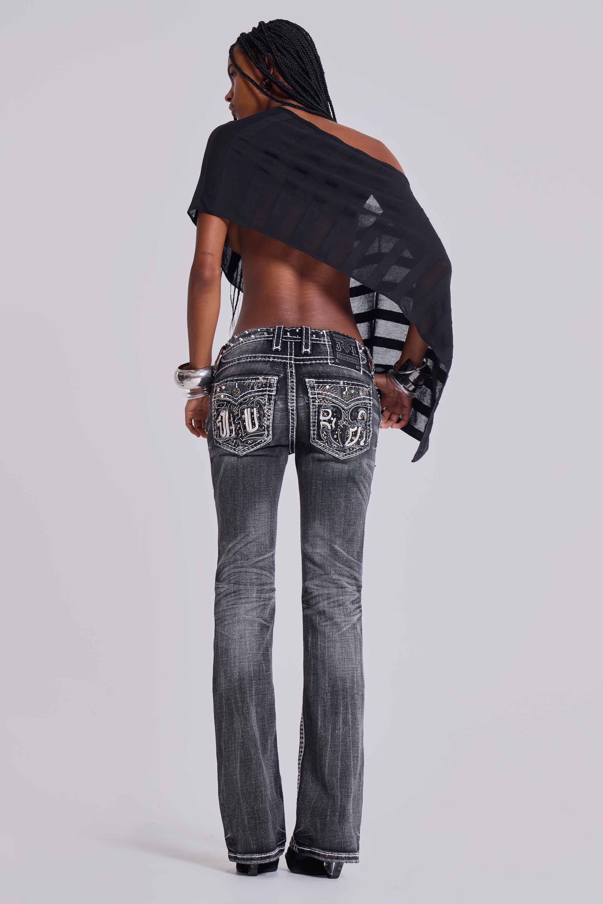 Rock Revival x Jaded London low-rise denim bootcut jeans in stretch washed black denim with branded back pocket details and metal hardware.