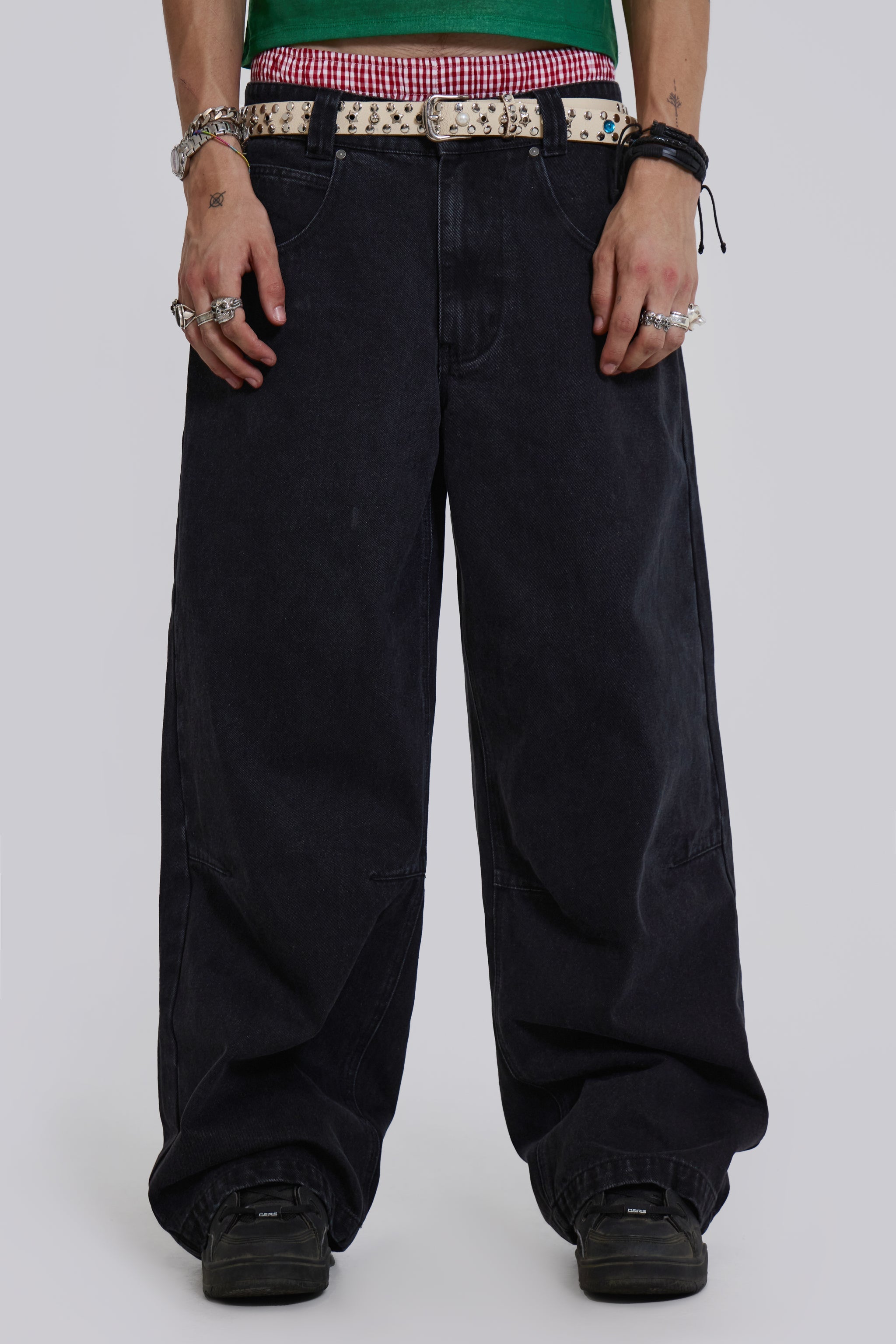 Introducing the Solid Black Low Rise Colossus Jeans. Our original low rise fit creates an unparalleled silhouette designed in an all-black colourway with black stitching. Thoughtfully placed knee darts enhance the comfort of this garment. making them ideal for everyday wear.
