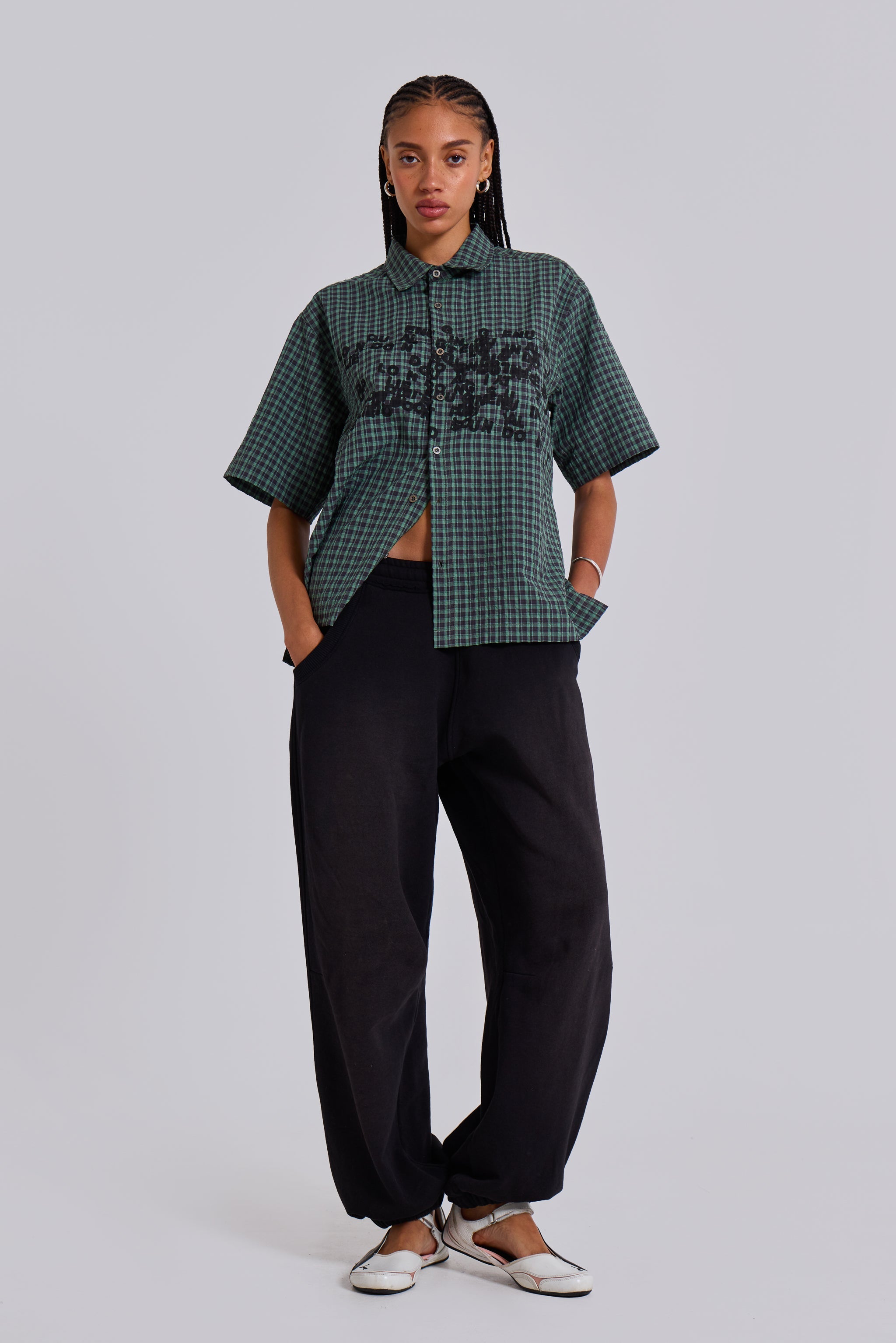 Crafted from a seersucker check cotton fabric in a black and green colourway. the Typo Shirt is designed in a boxy shape with a true-to-size fit. The shirt features yoke and shaping seams on the back and complete with patch pocket details.