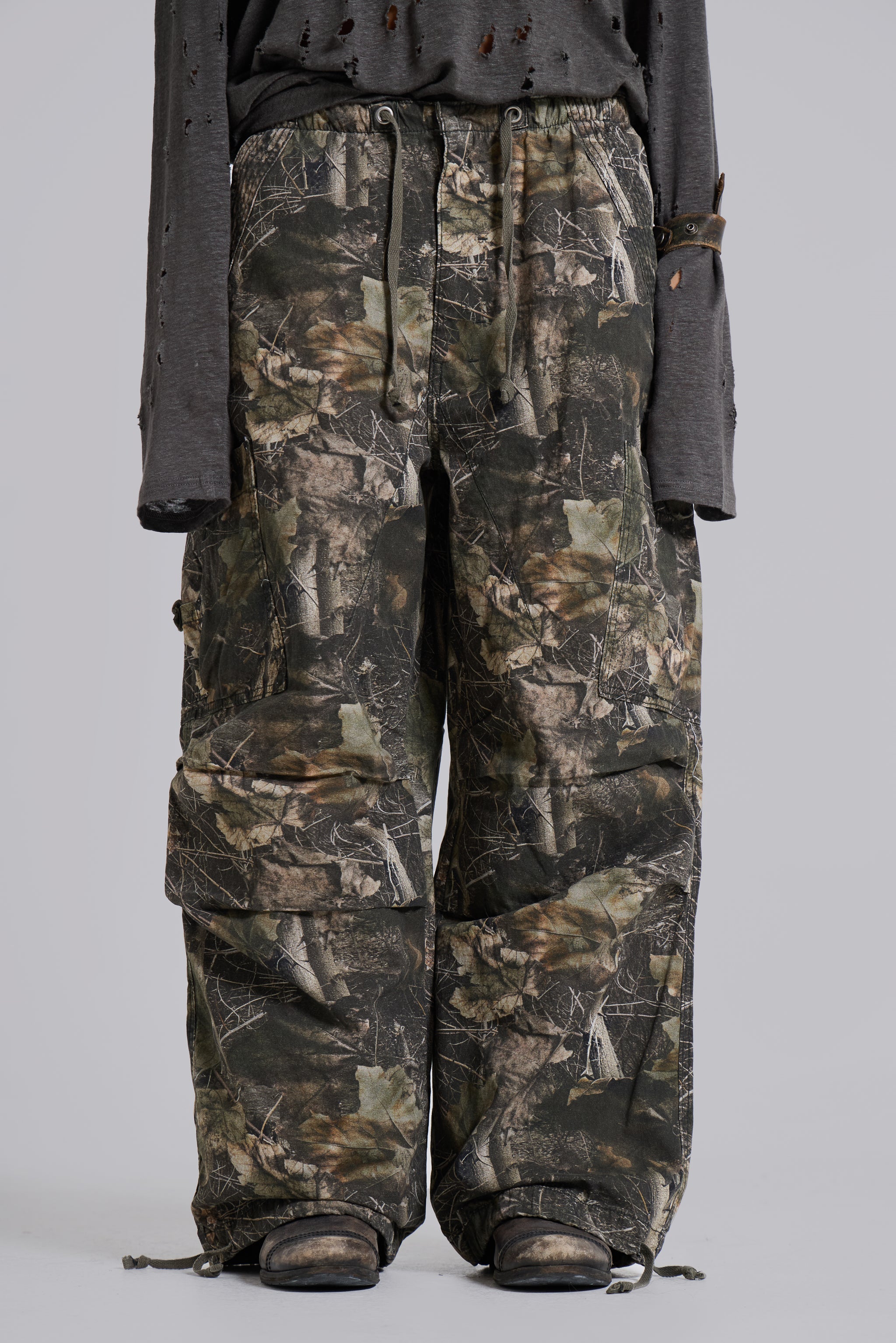 Designed with an oversized fit and a combination of metal eyelets. zip fly and adjustable cotton drawcord. our Woodland Camo Parachute Pants deliver refined luxury and ultimate comfort. Details such as a pleated knee and inside leg darts ensure a perfect fit. while a six-pocket styling and a unique airpod pocket provide functional convenience. Elevate any look with this timeless and classic silhouette.